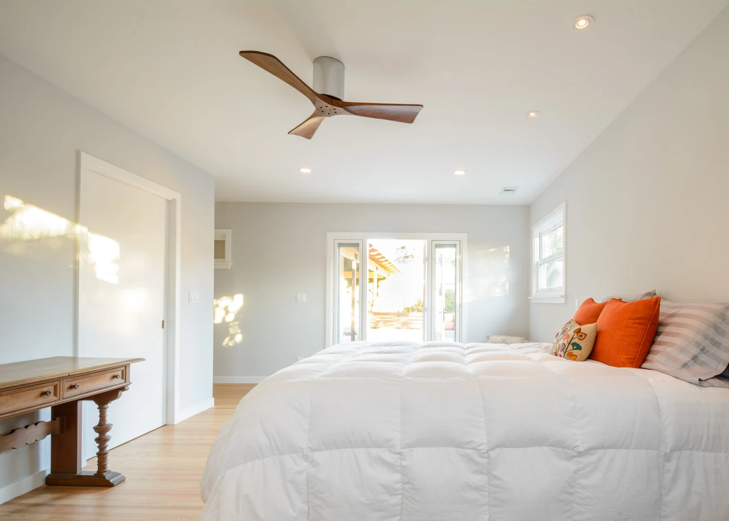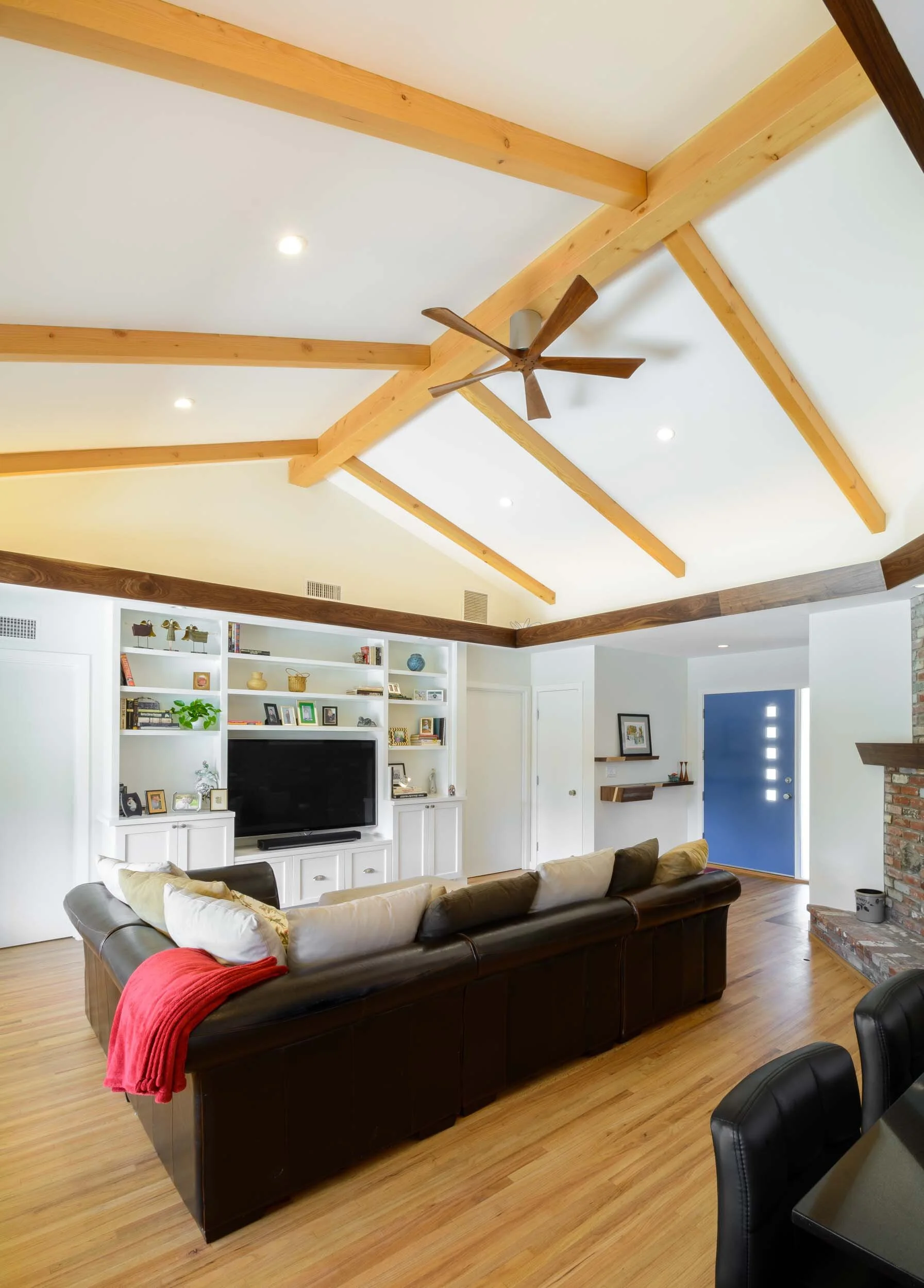 Modern backyard with a covered patio, dining table and chairs, a pool, and a contemporary house with large windows and sliding glass doors in the background, showcasing the seamless beauty of design-build home remodeling.